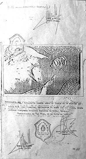 "Leticia Mabel Akselman fue secuestrada en la vía pública el 12/6/76 y después de 10 años a fuerza de buscarla me enteré que la habían asesinado a los 20 días con dos chicos del Colegio Nacional de Buenos Aires. Ella tenía 18 años y ellos 17. Leticia terminó el secundario en 1975. Aquí muestro dos certificados escolares. También la carátula del expediente que inició la policía llamada por los vecinos que en la madrugada del 3 de julio oyeron las ráfagas de ametralladoras y al otro día encontraron los tres asesinados. Muestro también dos fotos con el cuerpo lleno de balas (de las muchas que figuran en el expediente). La querella que inicié está incluída en la causa 450 a Suarez Mason, sin que se haya hecho justicia.